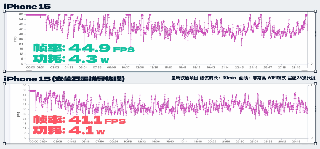 我們把 iPhone 16 的散熱膜移植到 15 上後, 15 的星鐵 30 分鐘跑圖,幀率反而下降了,只有 41.4 幀,功耗也才只有 4W ( 4077mW )!