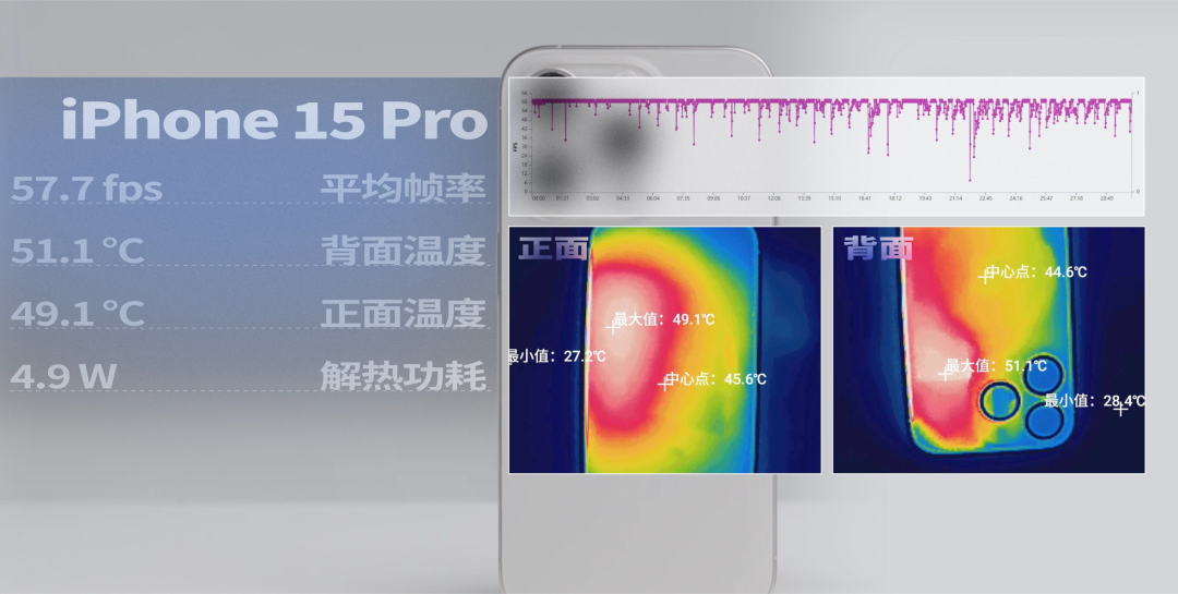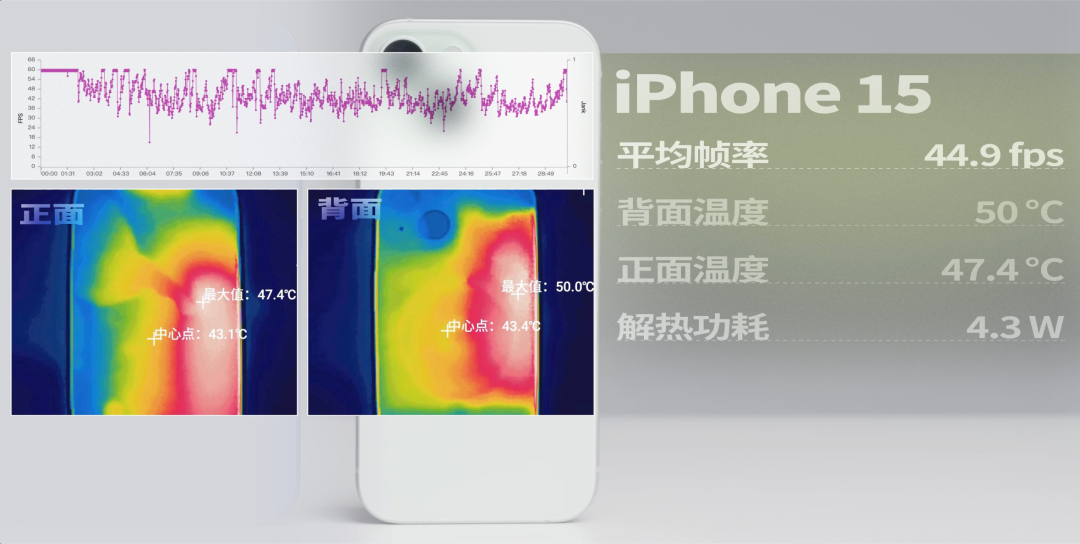 iPhone 15 的平均幀只有 44.9 幀,背面的温度為 50 ℃,正面為 47.4 ℃,功耗為 4.3W ( 4280.7mW 四捨五入 )。