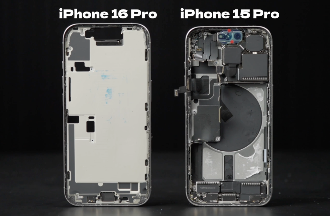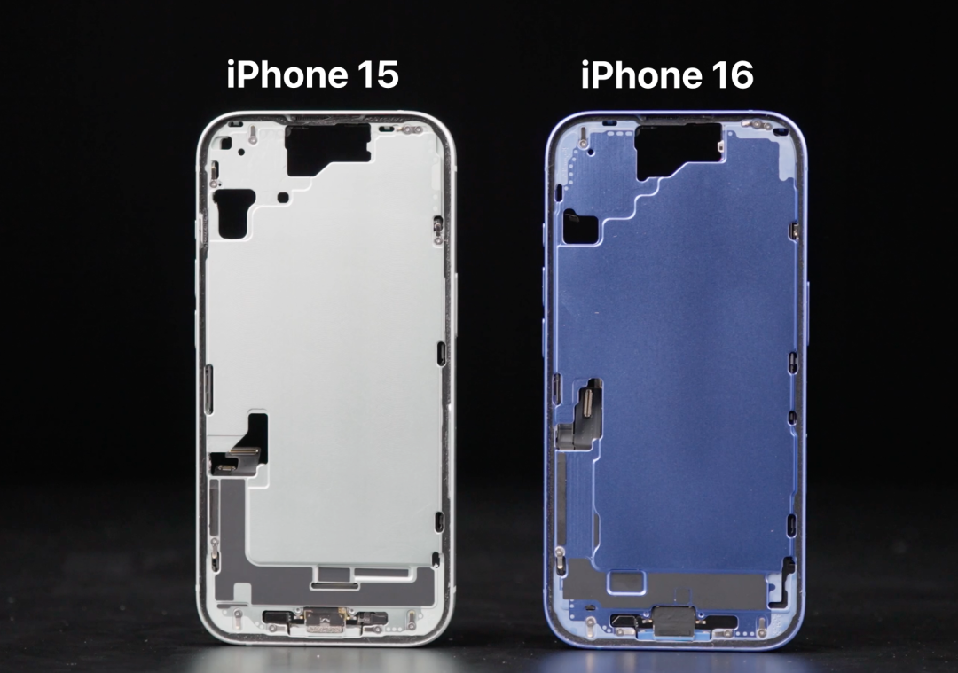拆開 iPhone 15 Pro 和 16 Pro 後,我們會發現, 16 Pro 也是經典三明治,而 15 Pro 的結構則有點不一樣,底部的鋁框架和背板共同組成了一個底殼,元器件都組裝在這個底殼裏面,最後再封裝屏幕。