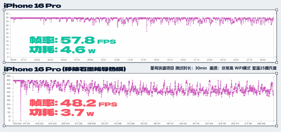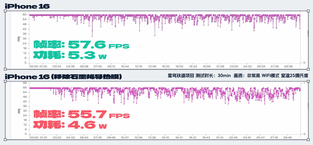 為了證明這點,我們又做了一輪測試——在移除了 iPhone 16 和 16 Pro 機身內的石墨烯導熱膜之後, iPhone 16 的星鐵幀率從之前的 57.6 幀下降到了 55.7 幀,功耗也下降為 4.6W ( 4585.8mW )。