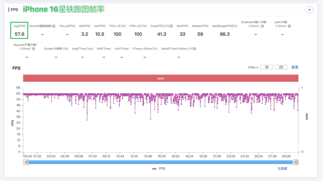 相比之下, iPhone 16 的平均幀來到了 57.6 幀,這樣一算,幀率確實有 28% 左右的提升,很接近蘋果 30% 提升的説法,所以前面的謎題,咱們算是解開了一部分。