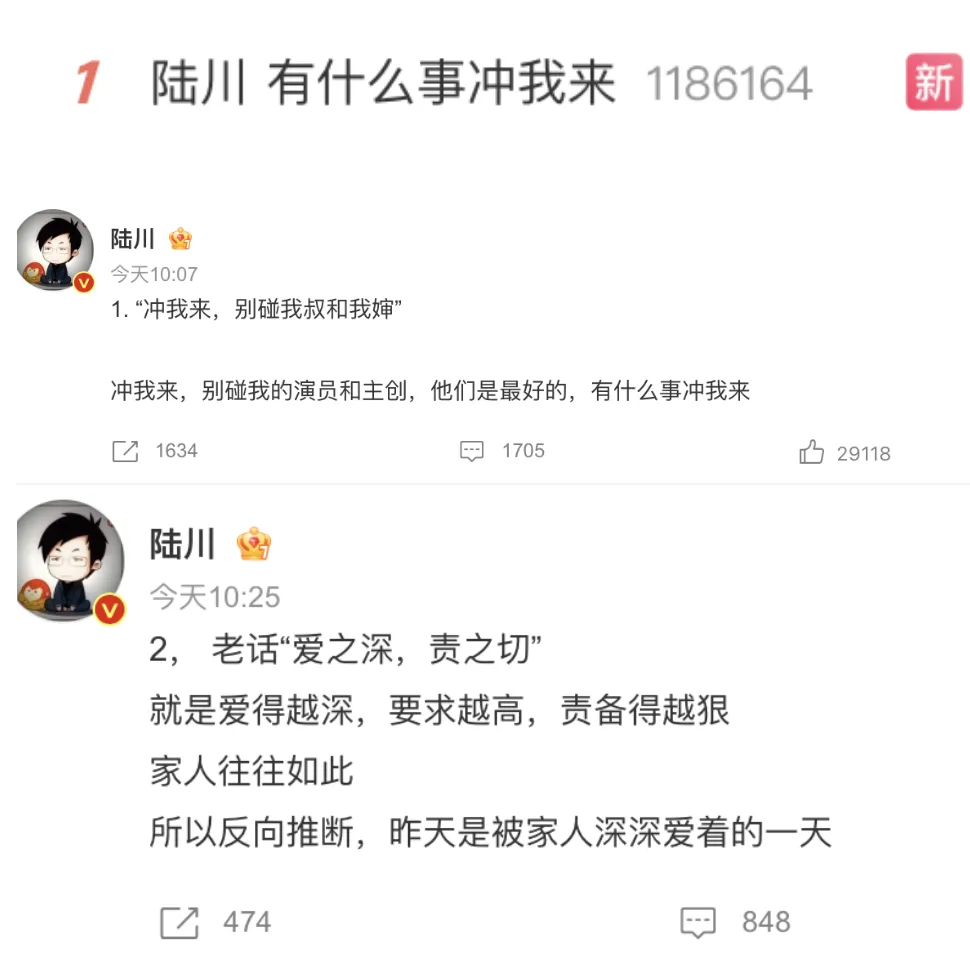 而今天,陸川怒發兩條微博,守護自己的主創與演職團隊。