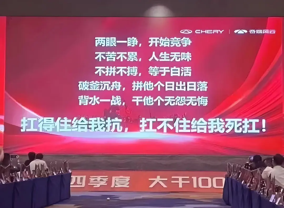 不過,車企們對於生產效率的追求達到了極致,壓力自然就會傳導到品牌側、銷售端等環節。最近又一次登上熱搜的奇瑞汽車,就是因為華南大區動員會上“奮戰四季度,大幹100天”“兩眼一睜,開始競爭”“扛得住給我扛,扛不住給我死扛”等一系列標語。