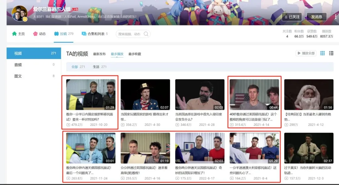 B站上有個比較著名的UP“愛爾蘭戲劇三人組”,他們最著名的一個視頻系列就是“快速通關某國移民面試”。在這個系列的視頻裏,幾乎每一個面試官的口音、表演、問的問題,都充斥着密集的對某個國家的“地域歧視”——比如英國的足球流氓問題。