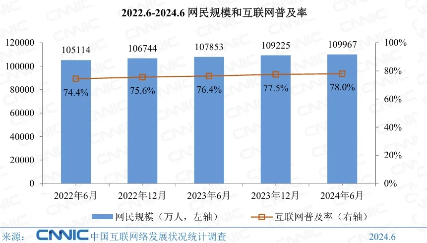 根據中國互聯網絡信息中心(CNNIC)在2024年8月29日發佈的第54次《中國互聯網絡發展狀況統計報告》,我國的網民規模已經非常接近11億,互聯網普及率達到了78%左右。