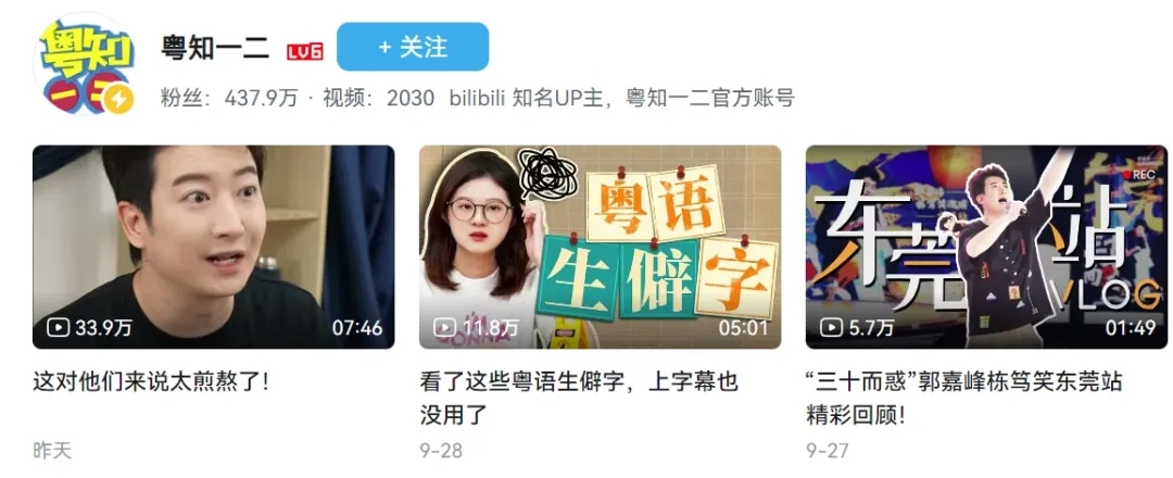 拿各地文化差異作為題材的,更是當今流量密碼之一。比如B站上的“粵知一二”,憑藉以廣東文化為核心做一系列偏向搞笑類的節目,已經在B站收穫了四百多萬的粉絲。