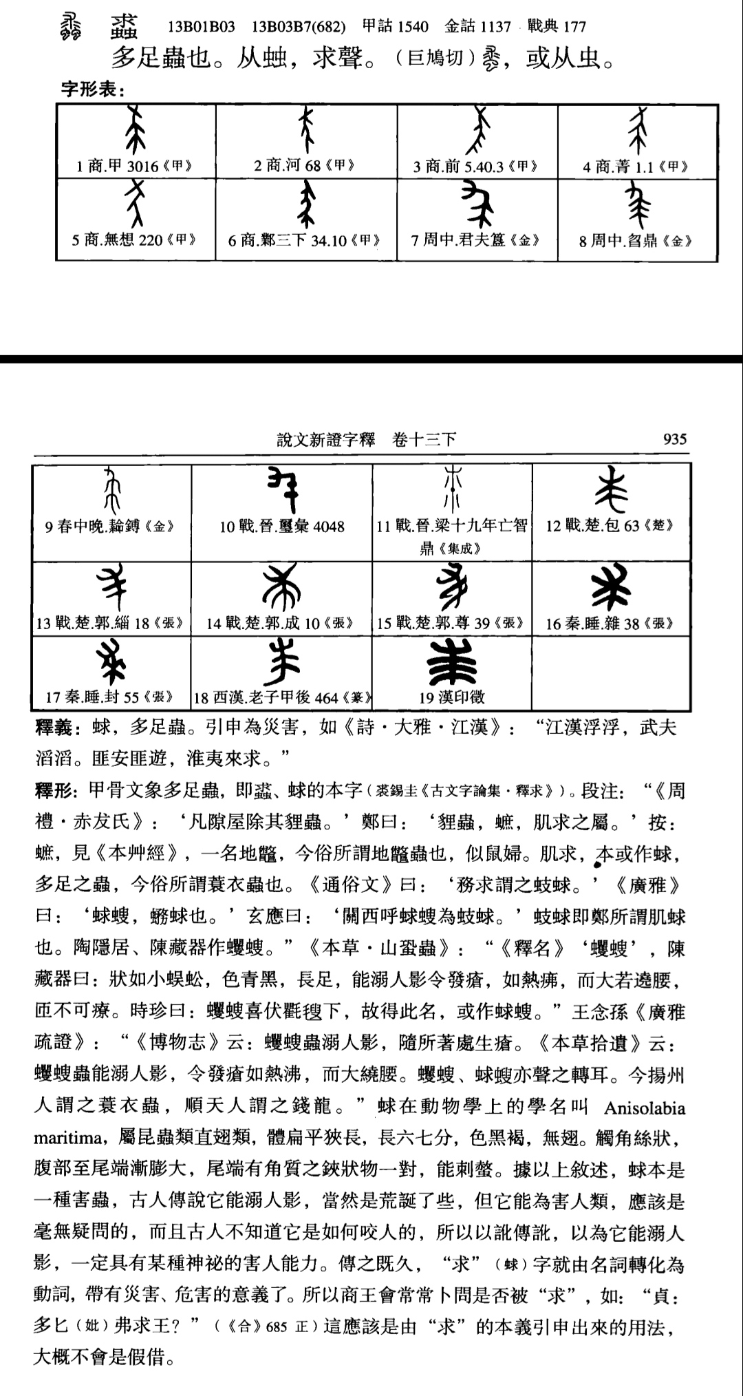 追逃雙方恨不得多長几條腿。部分【求】字形又像多足蟲(蜈蚣、蚰蜒、千足蟲等),可釋讀為求(蛷),然而由此不足以説明【求】系列字的複雜用義。