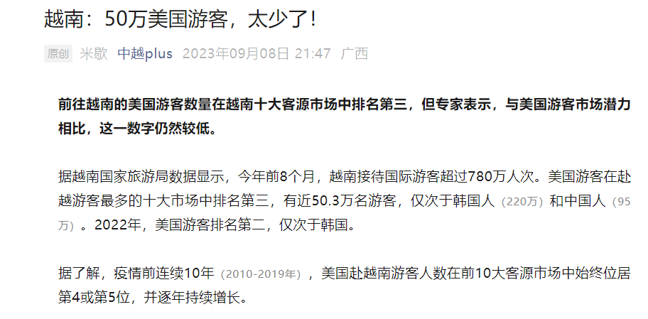 但是從越南接待國際遊客來源來看,美國作為太平洋對岸國家,卻高居越南國際旅遊客源市場前三,可見兩國關係確實並不差。