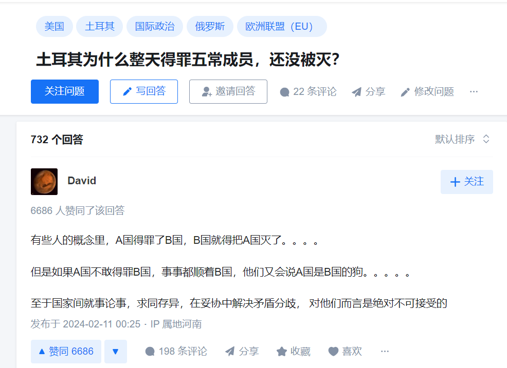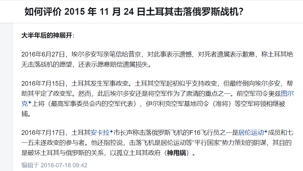 關於土耳其,如何在五常之間合縱連橫,在大國夾縫之間獲得生存空間,前兩年埃蘇丹面對的政變危機,特別有説服力。關於這場政變的原因,撲朔迷離,咱們普通人根本説不清楚,但是背後有美帝影子,這大概是肯定的,然而就在政變之前,土耳其頻頻得罪了俄羅斯,尤其是2015年底,因為深度介入敍利亞引發的矛盾,土耳其擊落了俄羅斯戰機,可謂引發軒然大波,擊落別國戰機,在軍事上意味什麼?誰也想不到的是,大半年後,埃蘇丹面對政變,居然是普京提前給他打了電話,讓埃蘇丹得以脱身。
