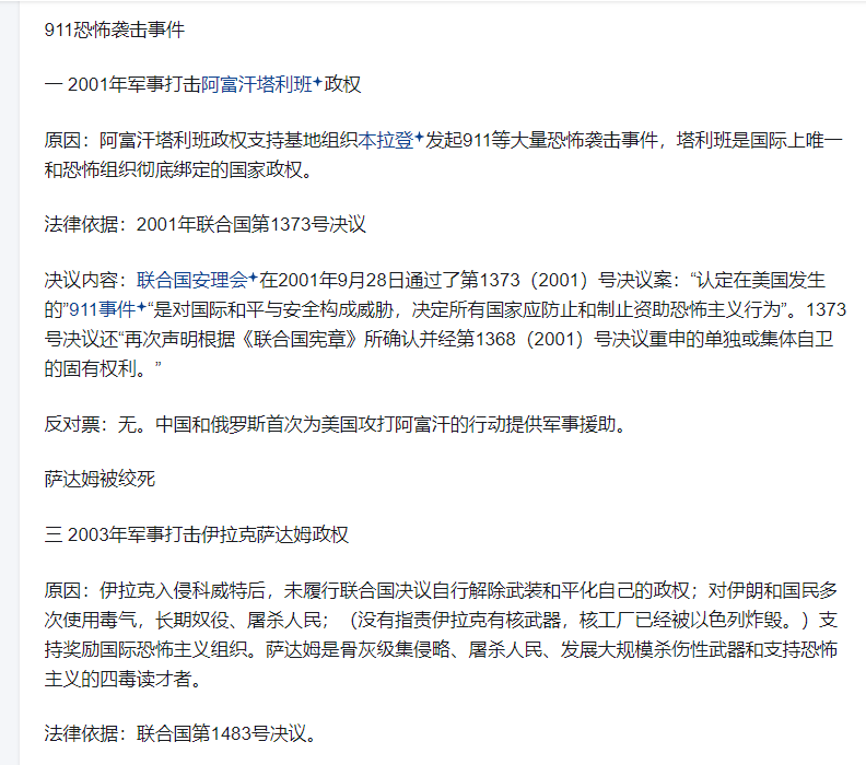 就説美帝好了,雖然二戰以後,很多人説美帝天天在打仗,不是在顛覆這個,就是在顛覆那個,但實打實來説,美帝真干涉別國,還真是找足了正當理由。第一次伊拉克戰爭,那是得到了聯合國授權,也是伊拉克侵略科威特在先,後來的第二次伊拉克戰爭絞死薩達姆,然後打擊塔利班政權……這一系列軍事行動,美帝都拿到了聯合國決議,五常沒有任何反對票。