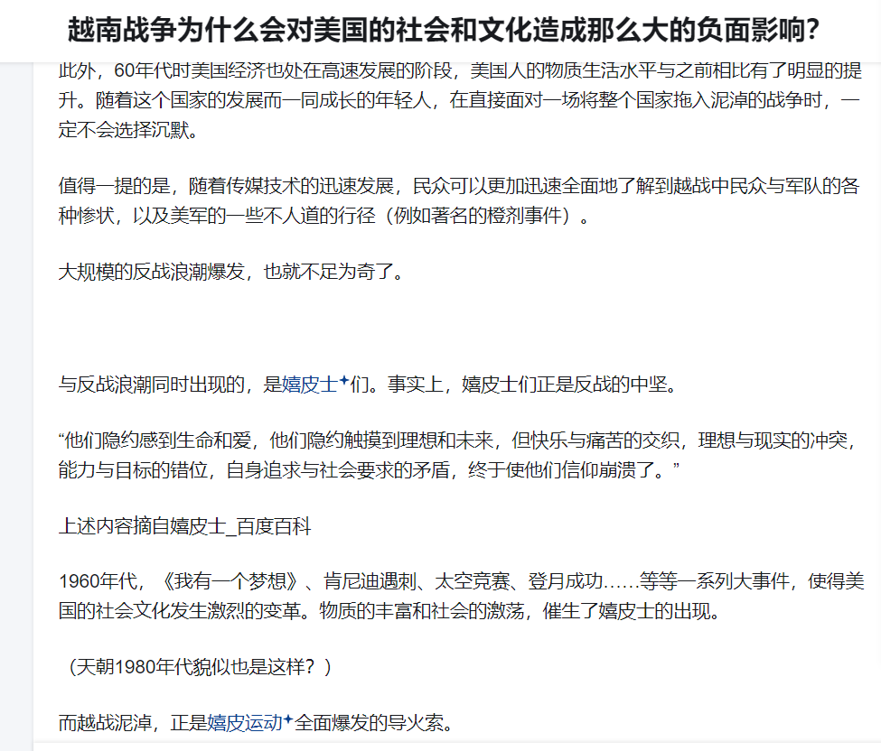 嬉皮士、迷茫的一代,是越戰給美國二戰以後嬰兒潮一代最直接的影響。為什麼會迷茫?因為美國人民發現,像二戰那樣去解放全人類的夢想破滅了,一切宏大口號,一切崇高目標,都破滅了。
