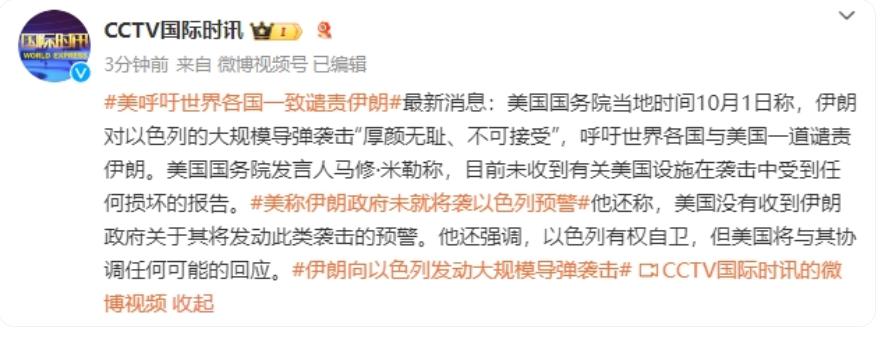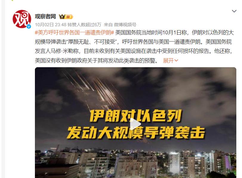 美國國務院當地時間10月1日稱,伊朗對以色列的大規模導彈襲擊“厚顏無恥、不可接受”,呼籲世界各國與美國一道譴責伊朗。