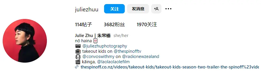 Julie是電影製作人、攝影師、播客主持人,致力於將新西蘭的移民故事帶到大眾的視野中。