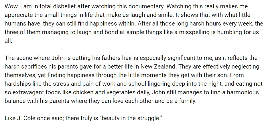 “當我看到John替爸爸理髮的片段,完全被觸動了。他的父母為了給他更好的生活來到新西蘭,犧牲了很多。但仍然會被兒子做的一些小事感動。”