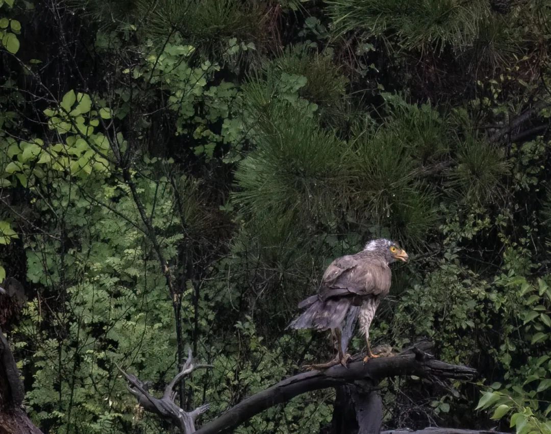 灰臉鵟鷹站在猛禽灣的枯樹上,腳下按着一隻中華大蟾蜍,它在這片林子裏繁殖。