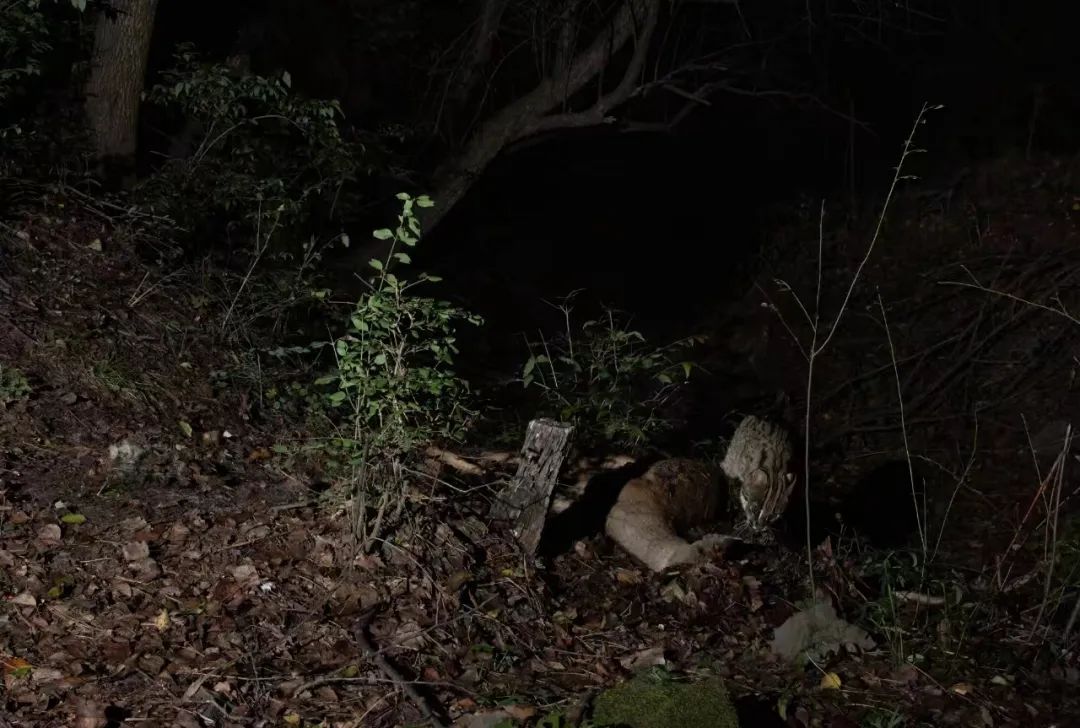 我們在狍子屍體旁邊裝了紅外相機,拍攝食腐的動物。這隻豹貓在“大餐”旁邊戀戀不捨地呆了一晚上。