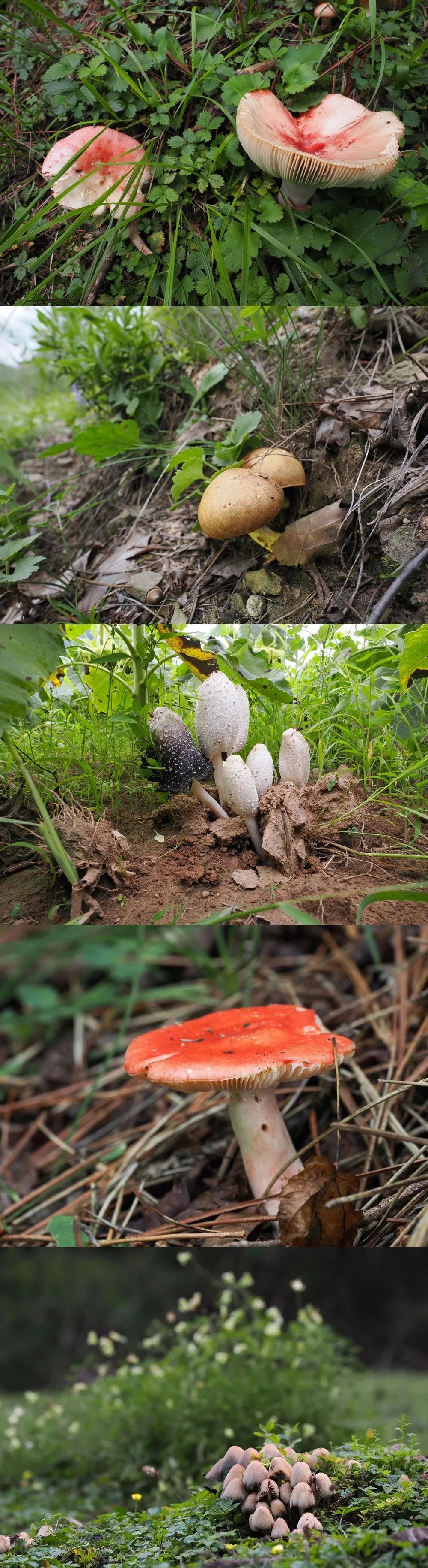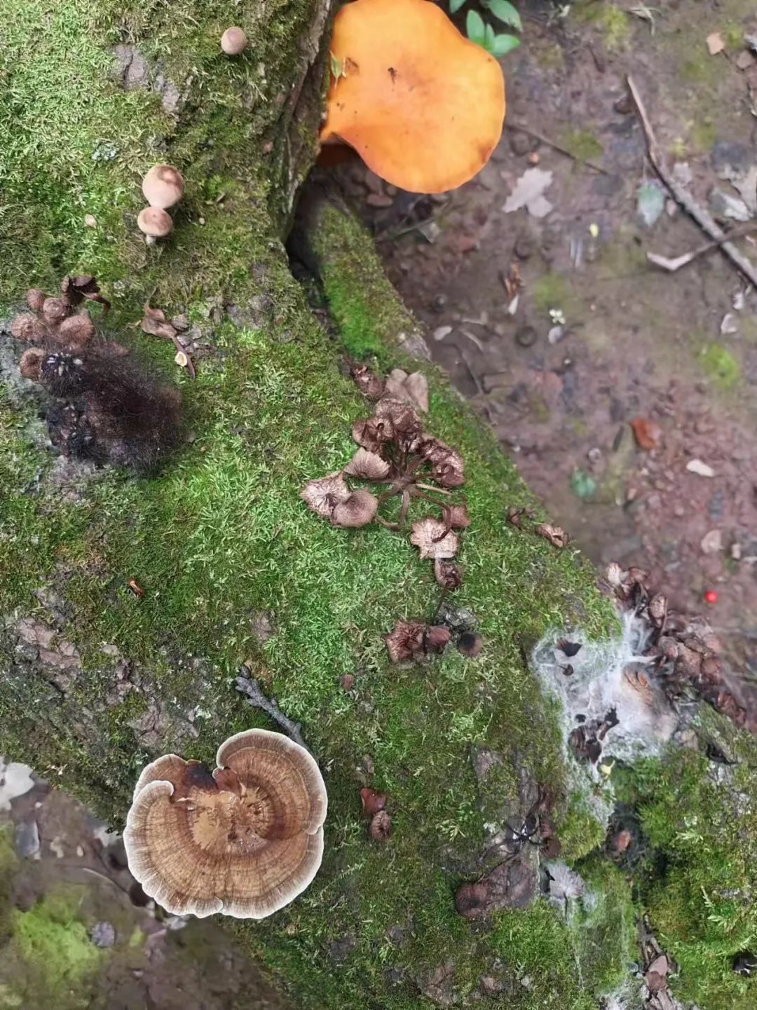 紅後在狐仙谷的一截木頭上發現了好幾種蘑菇。