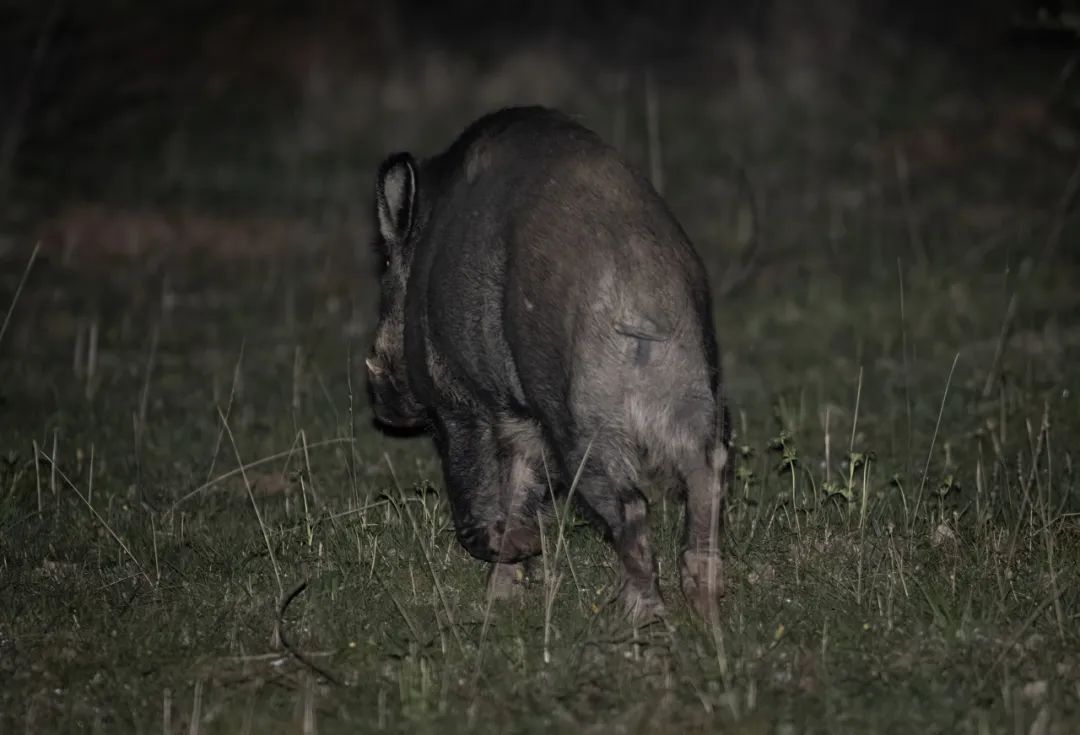 野豬夜裏在田邊覓食。野豬是臭名昭著的“農田大盜”,但今年野豬來到豹鄉田的並不多。今年山上是櫟樹大年,它們結的橡實夠野豬吃的。