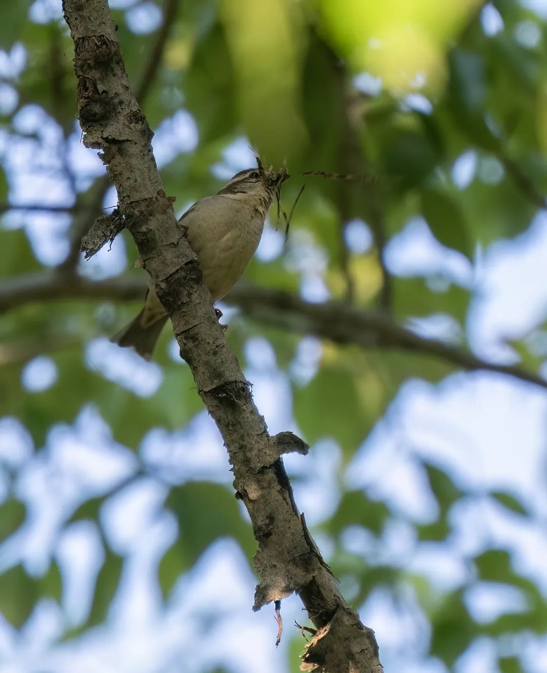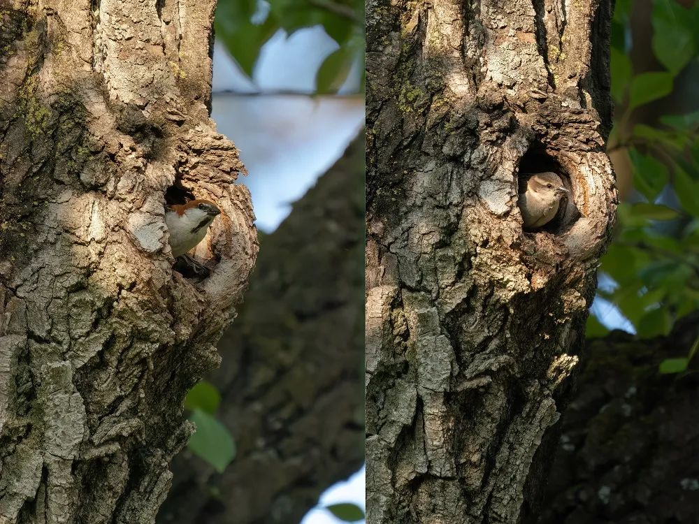 山麻雀在豹鄉田築巢。相比城市裏常見的樹麻雀,雄性山麻雀的“帽子”更鮮豔。築巢時山麻雀夫婦會輪流入巢,雄鳥在裝修,雌鳥在驗房。完成築巢後,雄鳥會在外面不斷鳴叫,彷彿在向雌鳥炫耀他的“功績”。
