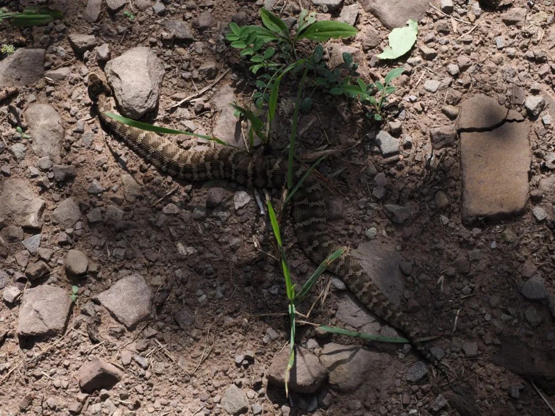 曬太陽的華北蝮,它把自己攤扁,最大限度貼着地面,吸收熱量。