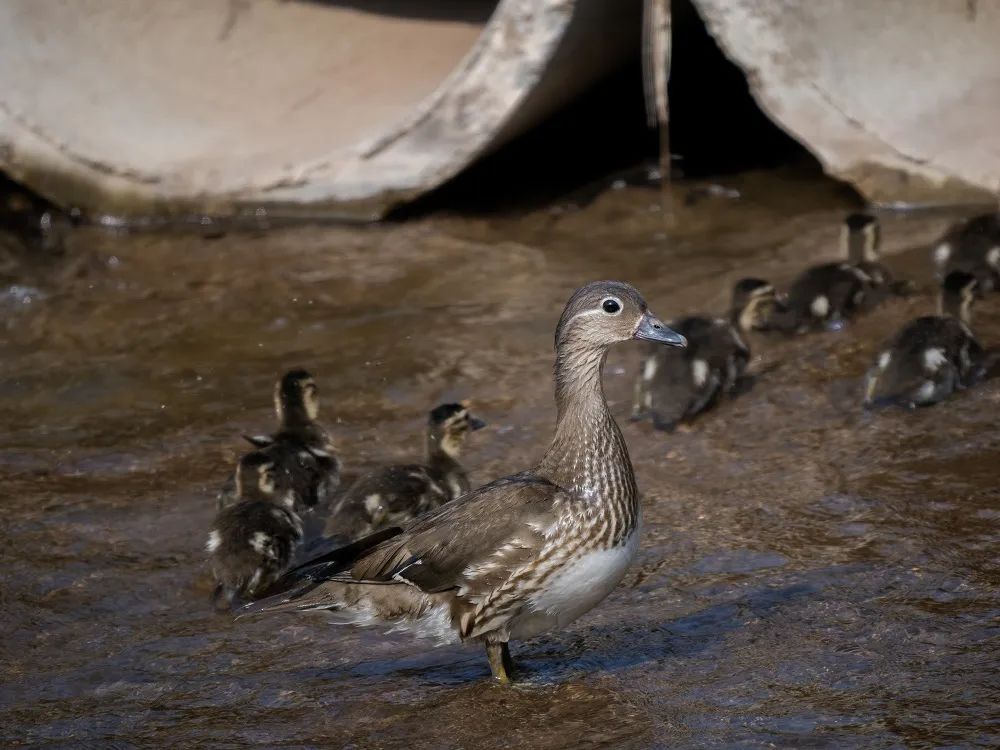 4月披着鮮豔繁殖羽的雄鴛鴦和7月在田那溪上游繁殖的雌鴛鴦。