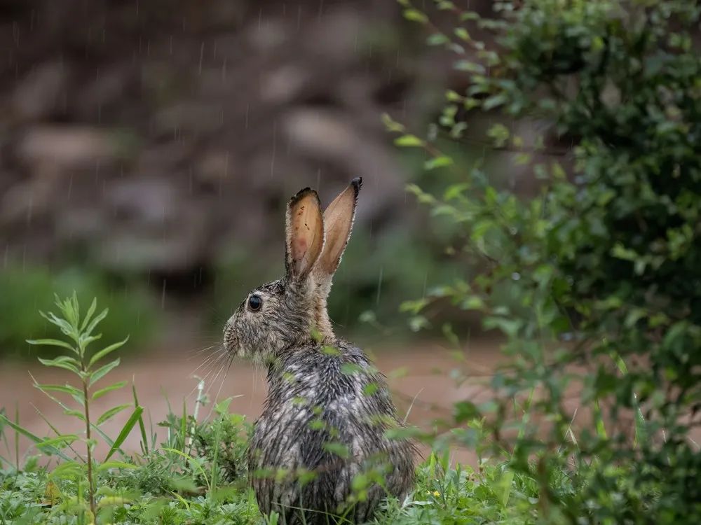 被雨淋得濕漉漉的蒙古兔。它也是到豹鄉田裏蹭飯的常客。