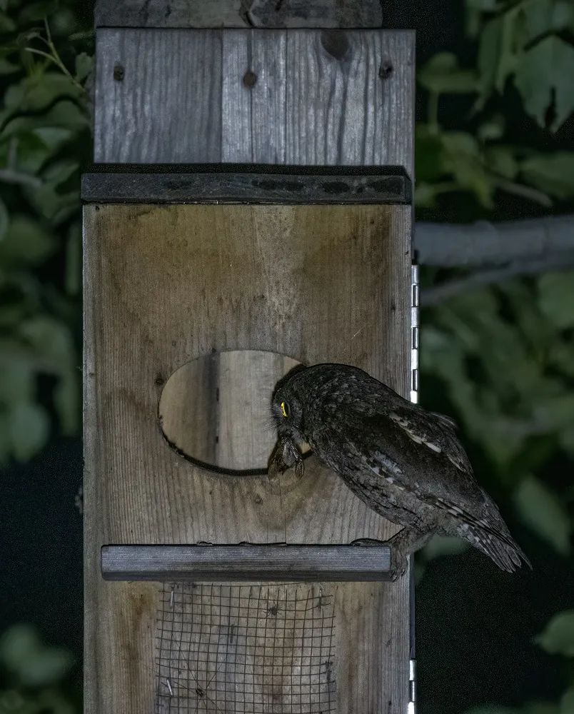2023年在豹鄉田繁殖的紅角鴞,叼着鰓金龜來喂雛鳥。豹鄉田不用農藥,因此讓鰓金龜吃掉了我們很多的土豆,但它們也是鳥類的食物來源。