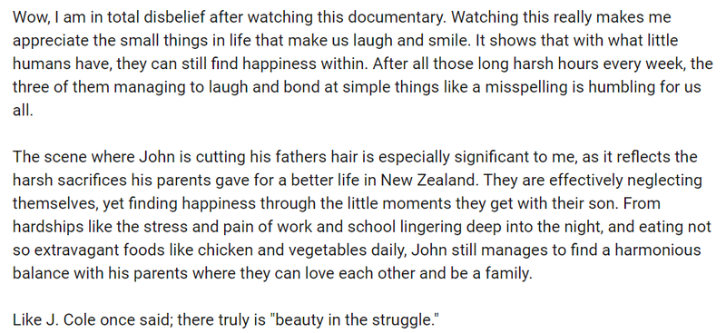 “當我看到John替爸爸理髮的片段,完全被觸動了。他的父母為了給他更好的生活來到新西蘭,犧牲了很多。但仍然會被兒子做的一些小事感動。”