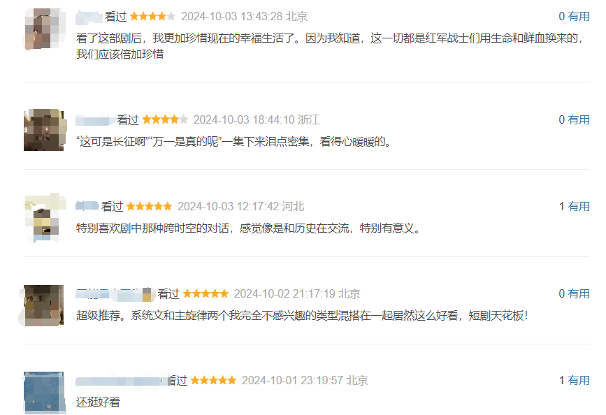 趙茜沒想到,自己在國慶假期裏刷短劇刷上了頭,這部名為《我在長征路上開超市》的系列短劇,融合了奇幻穿越與革命歷史於一體,故事以當代大學畢業生蘇梅梅的視角,講述了她穿越到長征途中為紅軍送物資、見證紅軍戰士一次次浴血奮戰的故事。趙茜告訴文娛價值官,自己之所以刷到停不下來,是因為這部劇裏傳遞出的温暖和樸素的家國情懷,很符合國慶假期的氛圍,劇中的正能量讓人血熱沸騰,有種“能量回流”的滿足感。