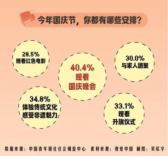 根據中國青年報社社會調查中心聯合問卷網(wenjuan.com),在國慶節對1334名受訪者進行的一項調查顯示,40.4%的受訪者觀看了國慶晚會,34.8%的受訪者打算體驗傳統文化,感受非遺魅力,33.1%的受訪者會觀看升旗儀式,30.0%的受訪者會與家人團聚。