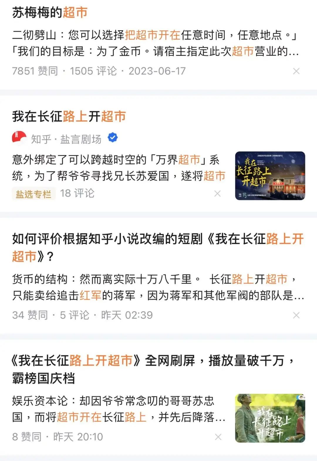 熟悉知乎的網友都知道,《長征路上開超市》是知乎上受歡迎的穿越題材,不少年輕人嘗試這個題材進行“腦洞”創作,知乎鹽的付費網文《蘇梅梅的超市》,不難看出年輕創作者深諳紅軍長征故事的細節和典故,作者通過幽默又感人的巧妙設計,將革命素材進行二次創作,從而使00後、10後更容易接納和理解。