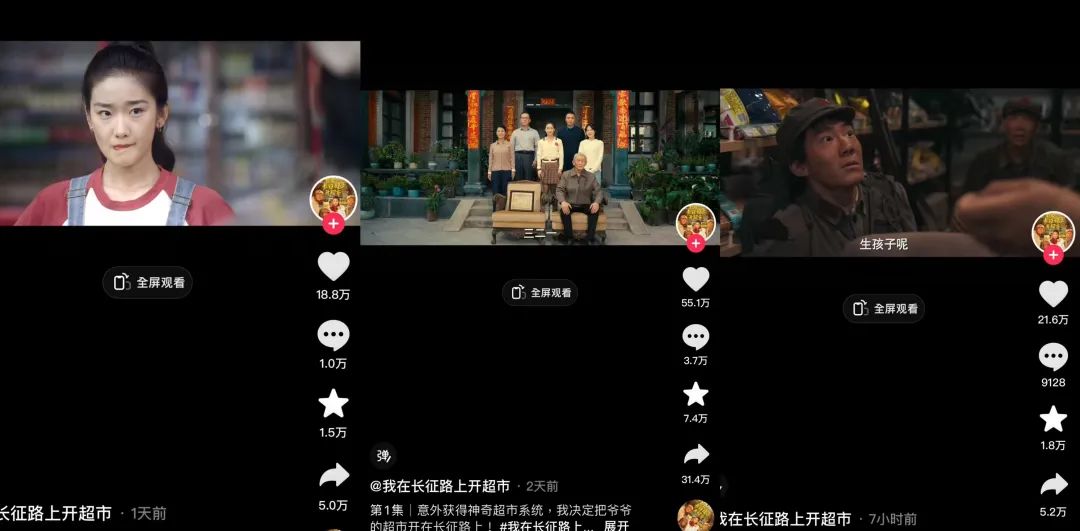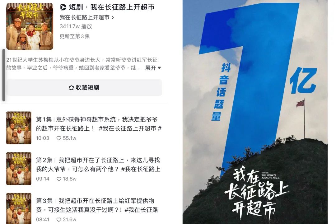 《我在長征路上開超市》官方微博發佈消息稱,該劇首日上線第一集,抖音平台7小時單集播放量破千萬,話題量破億**,微博正片播放量破100萬,成為這個國慶檔裏當之無愧的爆款短劇作品。**