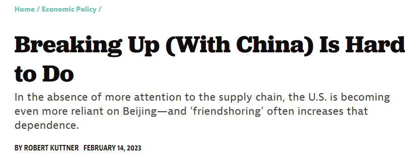 2. 其實多家外媒都發過“脱鈎很難”的新聞。2023年就有一些,FT也發了。這不是一個新發現,而是逐漸確認。如《The American Prospect》發文説,美國其實是越來越依賴中國了,所謂的“友岸外包”反而增加了依賴。這篇文章指出,“友岸外包”其實成了“中國採購”的委婉説法。