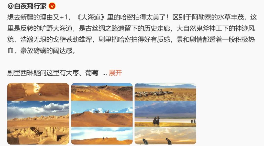 《大海道》便是一例。故事尚未完全展開的時候,它已經靠壯麗的風光、絕美的構圖與不俗的質感留住了觀眾。播出過半,在國慶假期氛圍的感染下,更有不少網友心癢難耐,直呼想要買張機票直飛哈密。不是文旅劇,勝似文旅劇。