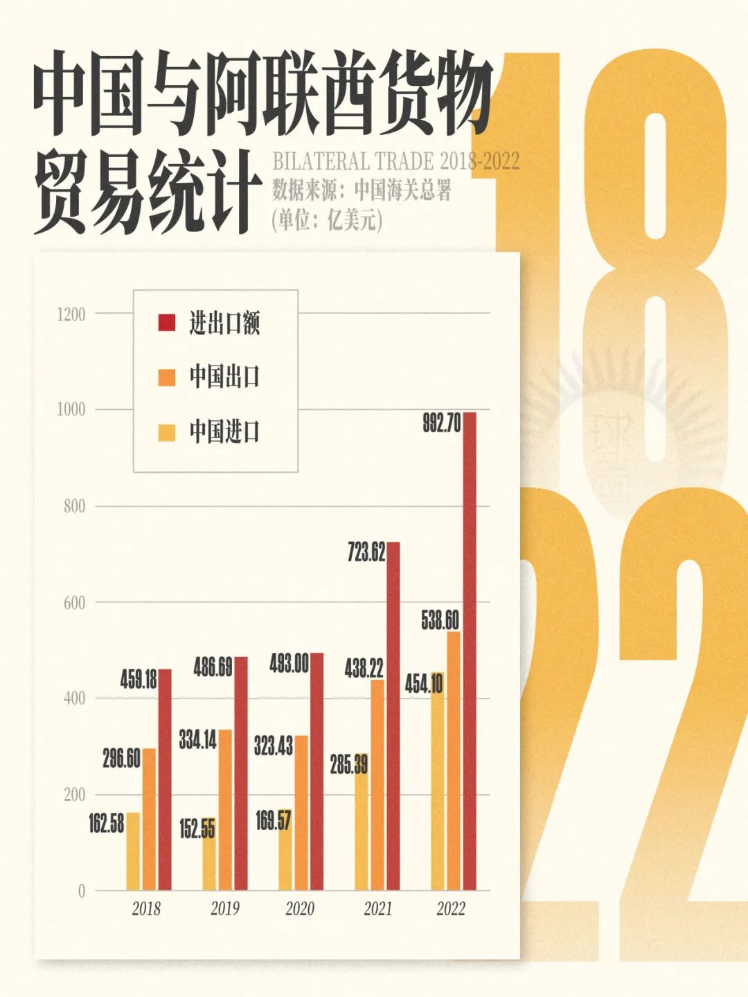 2022年,中國是阿聯酋非石油貿易中最大的貿易伙伴,雙邊貿易額達2645億迪拉姆。阿聯酋還成為中國境外遊目的地,2016年9月,阿聯酋宣佈對中國落地籤,大大便利了兩國交往,阿聯酋已經成為我國在中東地區的投資中心之一。