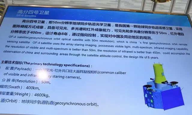例如我國的高分四號光學遙感衞星就屬於是高分辨率成像偵察衞星,它重約5噸、在軌壽命8年,具有凝視、區域、機動巡查三種工作模式。其配備的相機採用大口徑面陣凝視成像體制,可見光譜段分辨率為50米,中波紅外譜段分辨率為400米,特別是50米分辨率,相當於能從3.6萬公里外發現超級遊輪大小的海面目標。