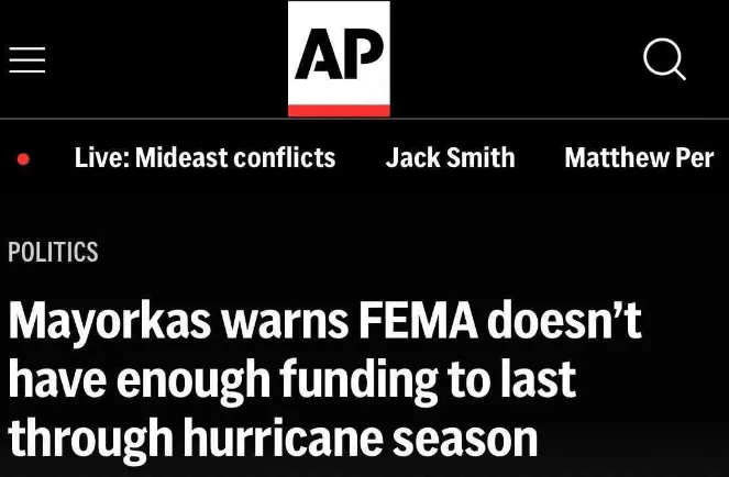 就在救災關鍵時刻,國土安全部部長亞歷杭德羅-馬約爾卡斯(Alejandro Mayorkas)週三卻表示,“聯邦緊急事務管理局(FEMA)沒有足夠的資金來度過今年颶風季節。”