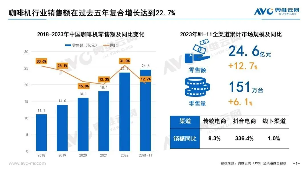 據奧維雲網推總數據顯示,咖啡機行業銷售額在2018-2022年五年間的複合增長率達到22.7%,2023年1-11月行業整體規模達24.6億元,同比增長12.7%。