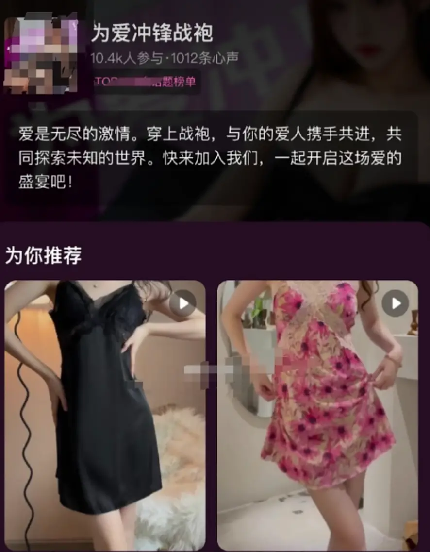 而小程序的內容博主們發的種種內容,也有相當一部分是打着“分享成人用品使用經驗”的旗號,或者掛着“展示情趣內衣”的名頭,擦邊帶貨兩不誤。