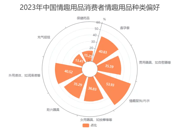 中國消費者的興趣,主要集中在避孕套、潤滑液這樣的剛需上,然後就是相對來説比較入門的情趣內衣,對於各種玩具的接受度就相對低一些,按摩棒等女用器具的接受度就在36%左右。