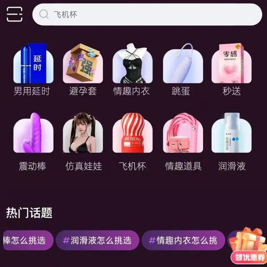 作為一家求財的企業,京東肯定不會那麼好心,平白無故給大家發擦邊福利,這個夜謎小程序對於京東的意義,主要是靠吸睛內容引流,打造一個成人用品合集專區。小程序裏面的玩具頻道,就是爆款成人用品的展覽會,從套子到杯子,再到情趣內衣、延時噴霧、仿真娃娃,各品類一應俱全。