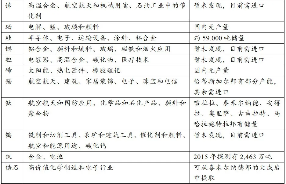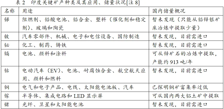 製造業的快速發展使得印度面臨不斷增長的礦產原材料需求。然而印度有限的礦物儲量、產能和強勁需求之間的落差(可見表3)使得印度部分種類礦產的對外依存度處於較高水平,這引起了印度政府的戰略焦慮。