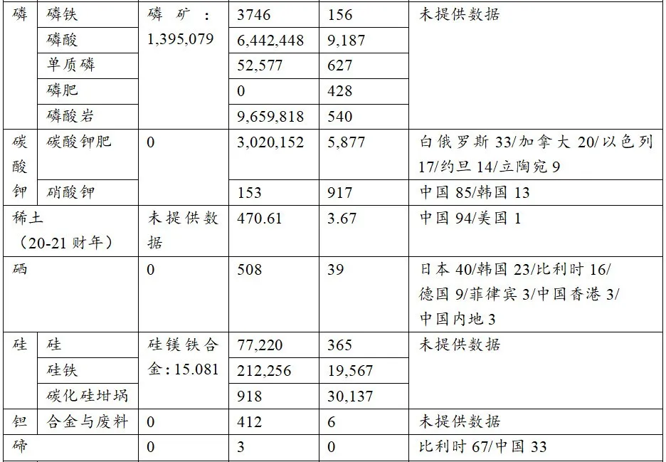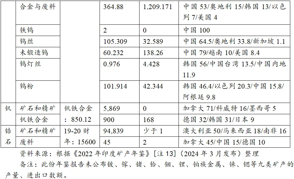 如表2和表3所示,在現今30類關鍵礦產中,銻、鈹、鉍、鎘、鈷、鍺、銦、鋰、鈮、錸、鍶、鉭、鎢、鎳、硒、碲和碳酸鉀共17種礦物因印度國內無儲量或冶煉、提取產能限制在2022~2023財年無出產,進口依賴度為100%;鉬、硅、錫、鈦、釩、稀土、鋯石共7種礦物的本土礦石產量同進口量之間有較大差距,尚不能滿足國內需求,自給率普遍低於30%;銅、石墨、磷等3種優勢礦物產量較多,但印度內部對其初、中級加工產品的消費需求仍高度依賴國外進口(鎵、鉿和鉑族金屬的資料暫未提供)。