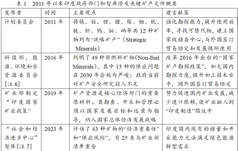 有鑑於此,自2011年起,印度多個政府部門和智庫對印度的礦產行業現狀發佈了調研報告,為後續國家關鍵礦產戰略的出台提供了有效的智力支持。其主要觀點可以概括如下: