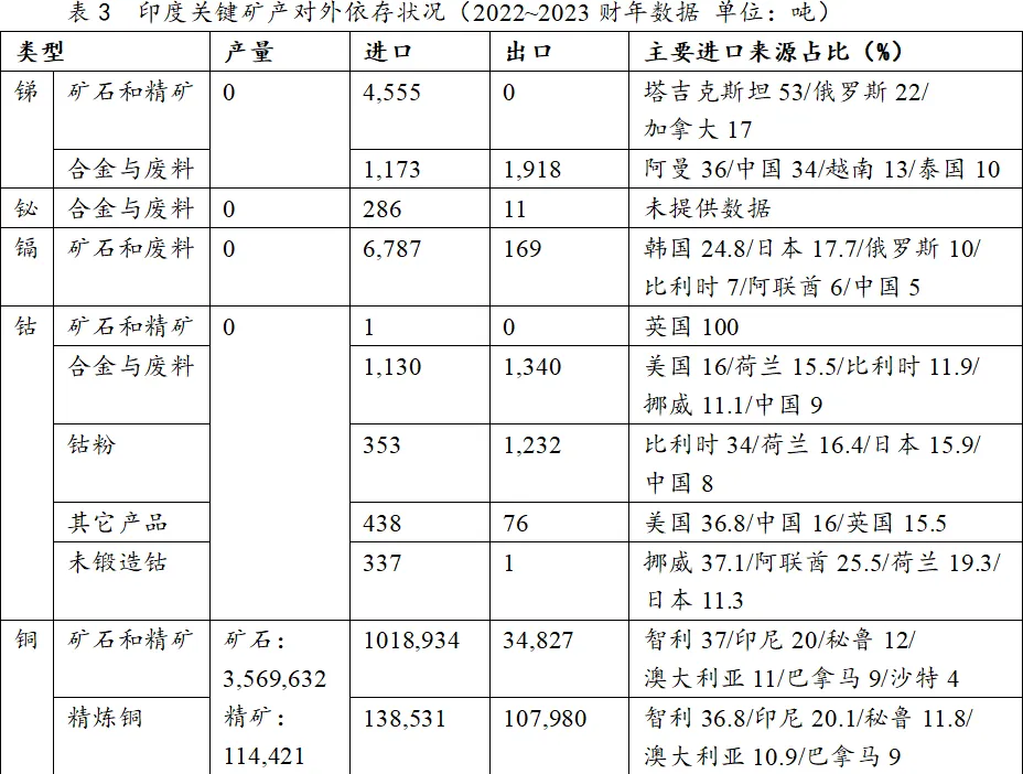 **首先,印度“貧油少礦”的困境十分突出,除了重晶石、鐵礦石和鋁土礦等少數幾類外,其餘絕大多數礦產資源儲量嚴重不足,高度依賴進口(謝鋒斌,2013)。**隨着印度政府力推綠色能源和高新技術產業發展,關鍵礦產總需求量和國內供給能力之間的缺口困局引起了印度政府的重視。印度工商部的數據顯示:2022~2023財政年度(2022年4月1日~2023年3月31日)內,印度對鈷、鎳、鋰和銅礦石等10種礦產的進口額達到創紀錄的110億美元,較上一週期增長34%。其中,鈷、鋰和鎳的進口依存度是100%,銅礦石則是93%[注4]。