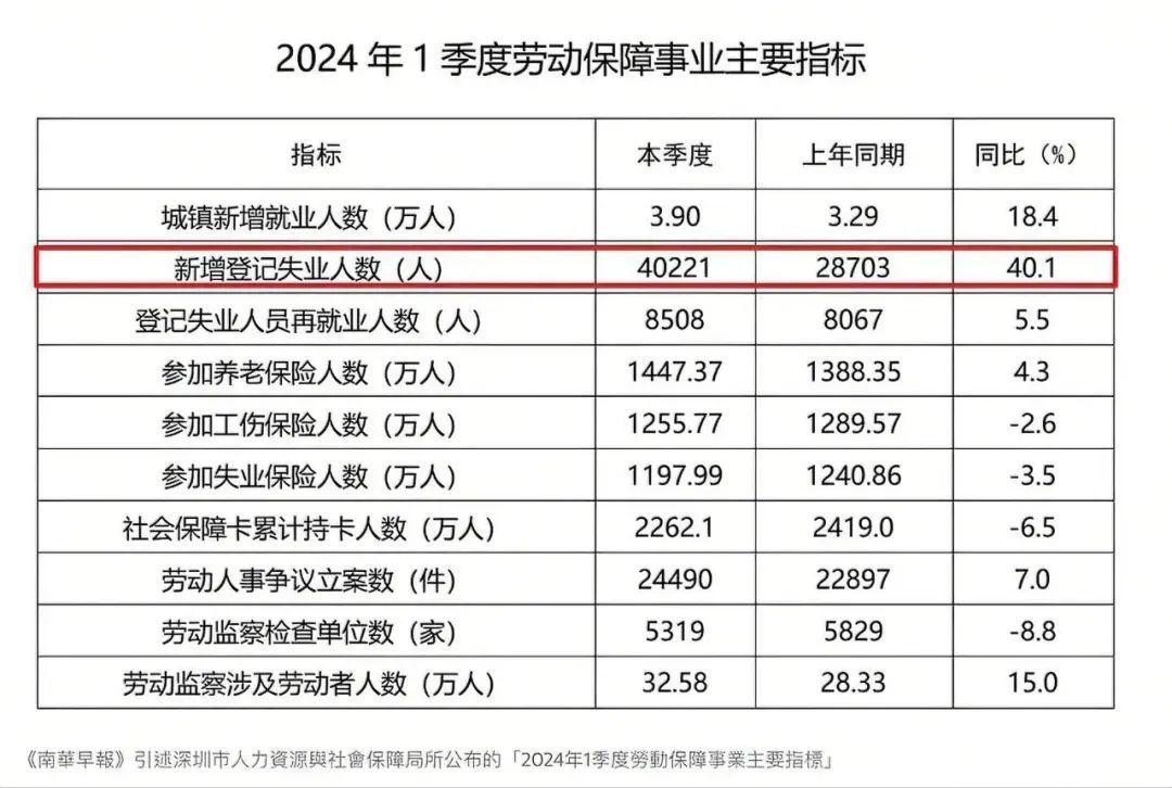 比起各大城市的避重就輕,深圳顯得十分勇猛,在2024年一季度就業數據裏,清楚列明新增登記失業人數,有40221人,同比增加了40.1%。