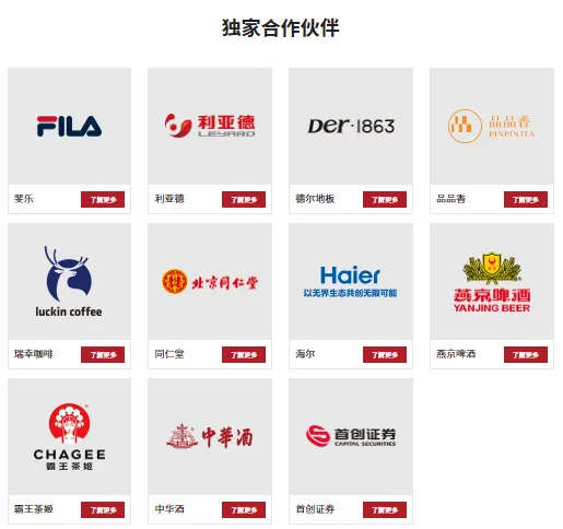 此外還有10個獨家合作伙伴,包括FILA、北京同仁堂、利亞德、海爾、Der.1863地板、燕京啤酒、品品香、霸王茶姬、瑞幸與中華酒。