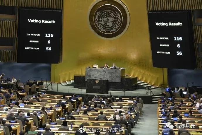 中國等116個國家投下贊成票,56票棄權,只有英國、美國、澳大利亞、以色列等6國反對。