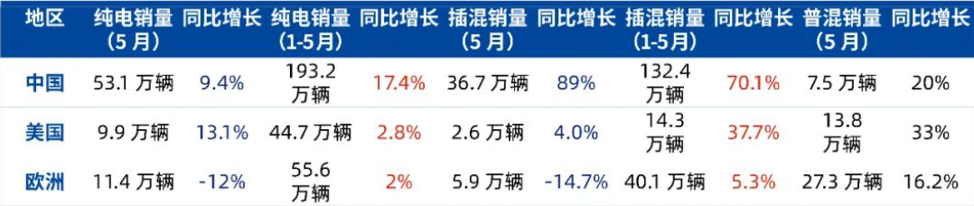 今年 1-5 月,中國市場純電同比增長 9.4% ,插混同比增長 70.1% ;美國那邊,純電同比增長 13.1% ,插混是 37.7% ;在歐洲,純電下降了 12% ,插混則增加 5.3% 。