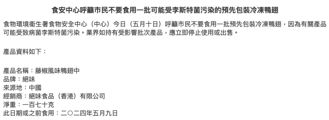 今年4月26日,絕味肉類和蔬菜產品因李斯特菌在加拿大被召回。5月9日,香港食物環境衞生署食物安全中心發佈公告稱,絕味食品(香港)有限公司銷售的一批鴨翅中可能受致病菌李斯特菌污染,要求停售及下架相關產品。